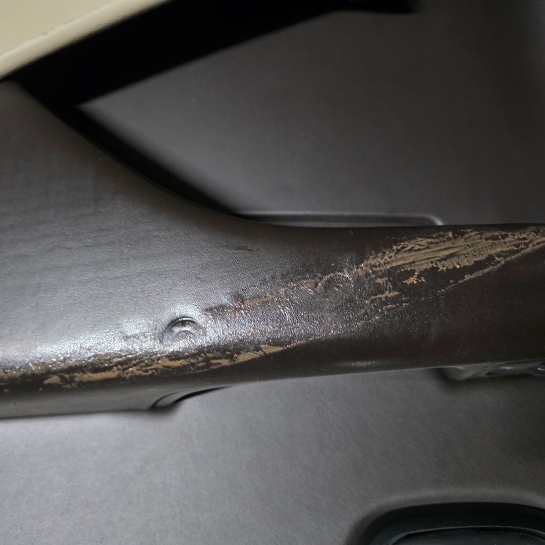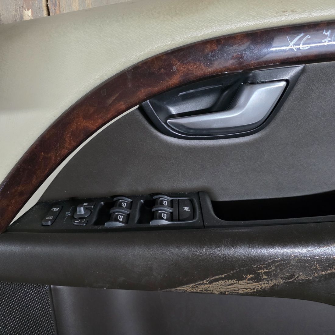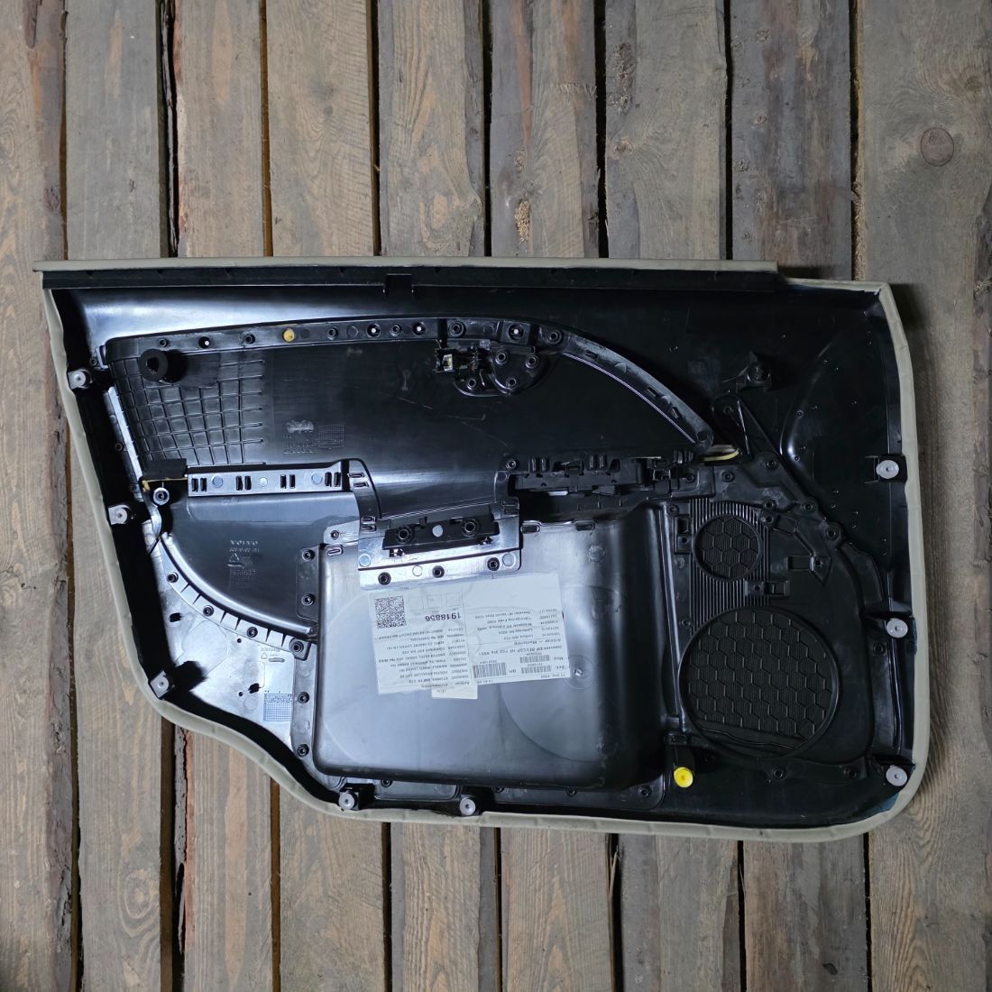 Обшивка двери (передней правой) в хорошем состоянии бежевого цвета, со вставкой под дерево, присутствует незначительный дефект (замятие) на подлокотнике.