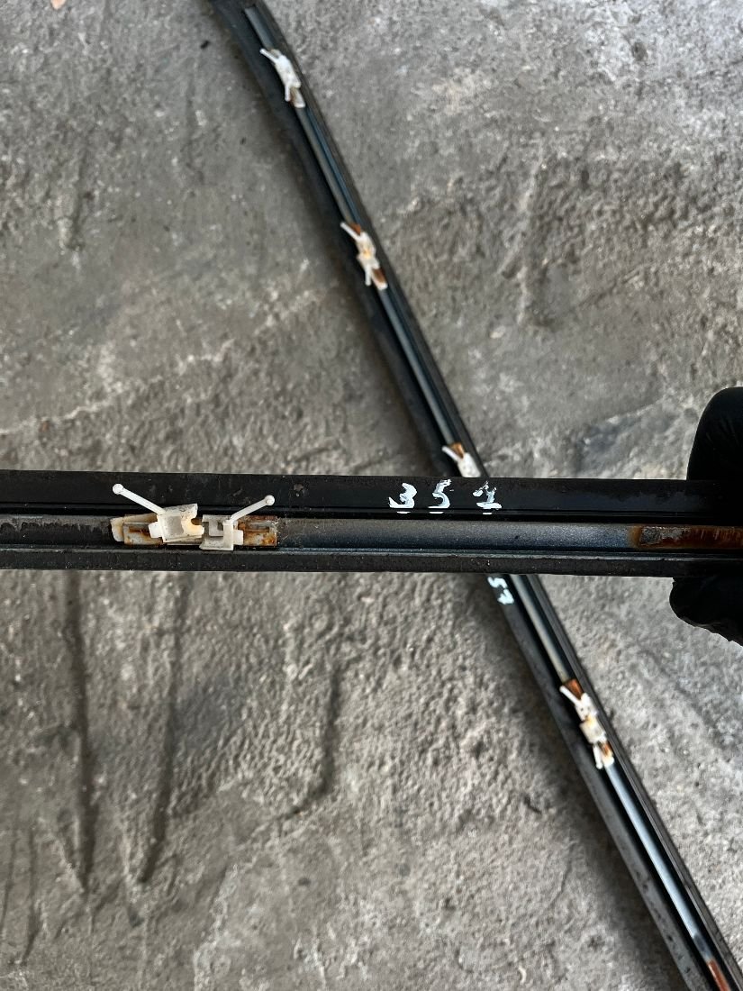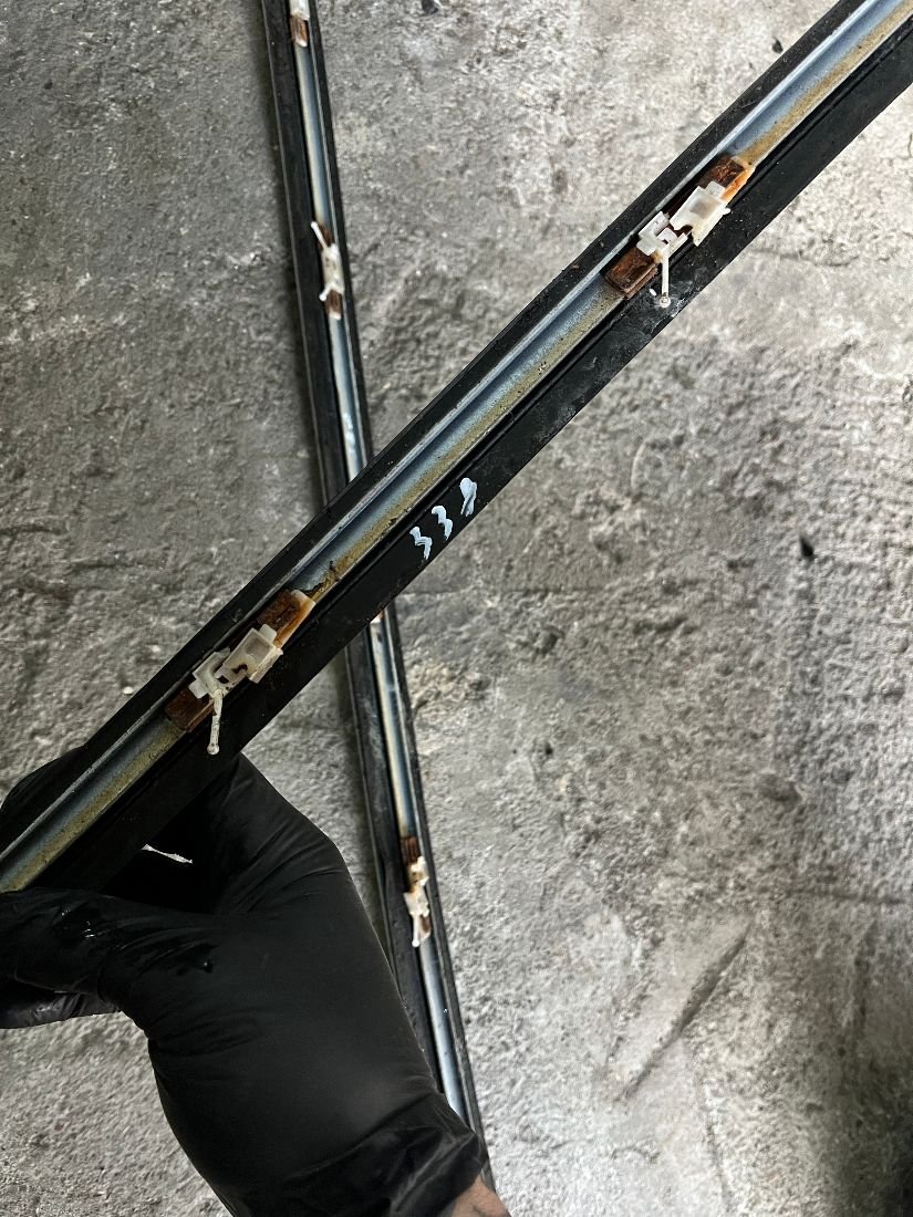 Комплект молдингов стекла левой и правой передней двери, в хорошем состоянии (с креплениями).